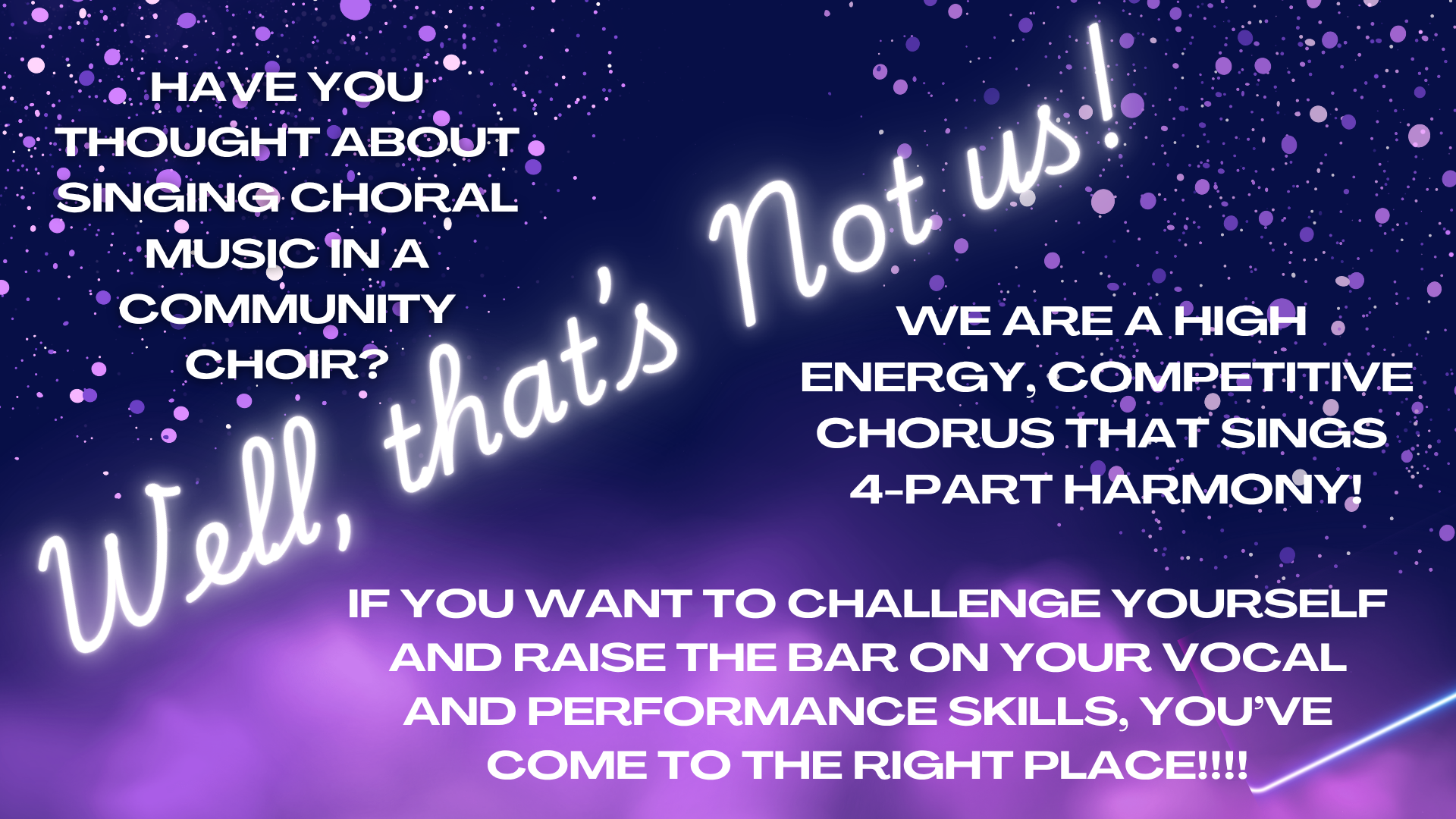 We are a chapter of Sweet Adelines International. We sing 4-part, a cappella harmony in the Barbershop style. We are a new kind of barbershop! We sing all kinds of music from pop to rock and roll to country.